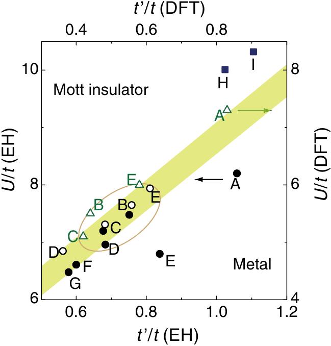 Access to finite temperature has been usually with dynamical mean field theory(DMFT). It has been the method of choice (Limelette & others (2003), Aryanpour et al. (2006), Galanakis et al. (2009)), mapping the many body lattice problem to a many body local problem, supplemented by a self-consistency condition (Georges & Kotliar (1992)). Some spatial correlations can be included via cluster DMFT (Parcollet et al. (2004), Ohashi et al. (2008), Liebsch et al. (2009), Sato et al. (2012)). Figure 20 shows phase diagram for anisotropic triangular lattice established by (a) Ohashi et al (Ohashi et al. (2008)) for using 4 site cluster based C-DMFT, and by (b) Liebsch et al (Liebsch et al. (2009)) using 3 site cluster. They use the double occupancy to characterize the Mott transition.